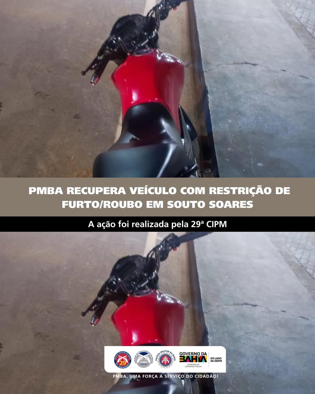 A Polícia Militar da Bahia recuperou uma motocicleta com restrição de furto/roubo na noite de sábado, 18 de abril, no município de Souto Soares, na Chapada Diamantina. A ação foi realizada por guarnições da 29ª CIPM durante rondas no centro da cidade.