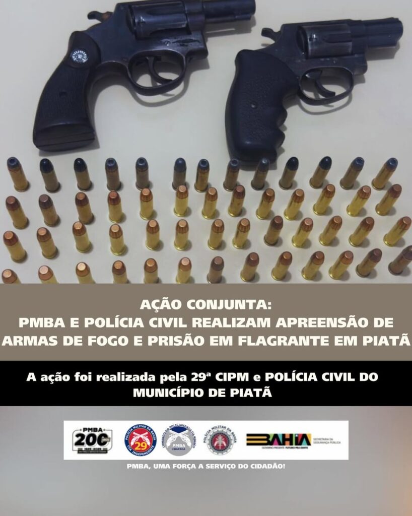 De acordo com informações oficiais, a guarnição de serviço de Piatã, em conjunto com a Polícia Civil, deu cumprimento a um mandado de busca e apreensão expedido pela Justiça. Durante a diligência, os policiais localizaram e apreenderam duas armas de fogo, ambas calibre .38, sendo uma com numeração suprimida e outra com numeração adulterada, além de grande quantidade de munições e armas brancas.