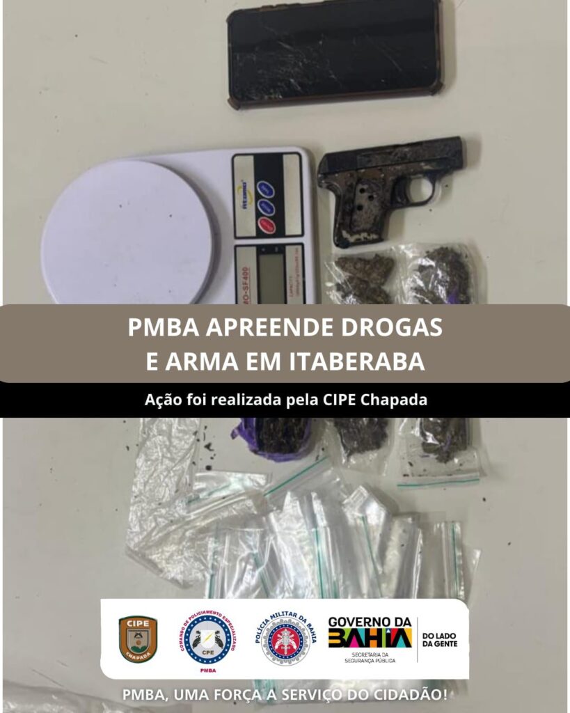 Durante patrulhamento especializado na Rua Francisco Gil, no bairro Pé do Monte, em Itaberaba, na Chapada Diamantina, a guarnição da CIPE/Chapada apreendeu drogas e uma arma de fogo. A ação ocorreu na última terça-feira (21) e resultou na prisão de dois indivíduos.