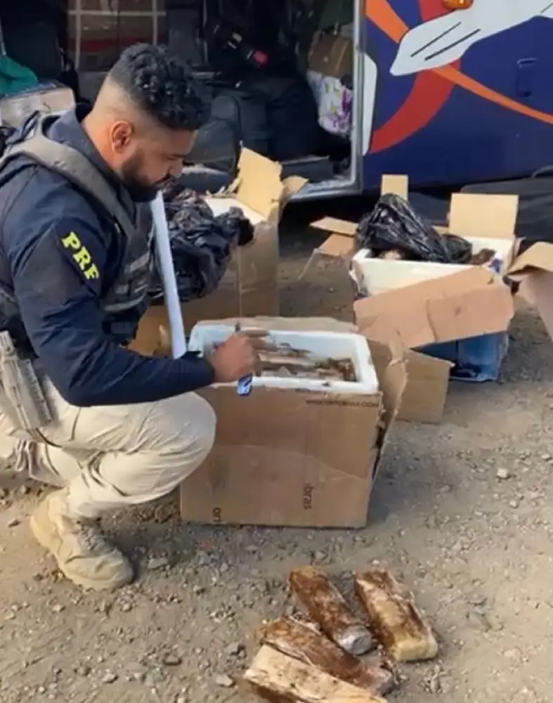Durante os procedimentos de fiscalização, a equipe decidiu vistoriar o ônibus e ao abrirem o compartimento de carga, os policiais acabaram encontrando mais de 200 tabletes de maconha que estavam acondicionados em caixas de isopor, utilizadas normalmente para refrigerar bebidas.