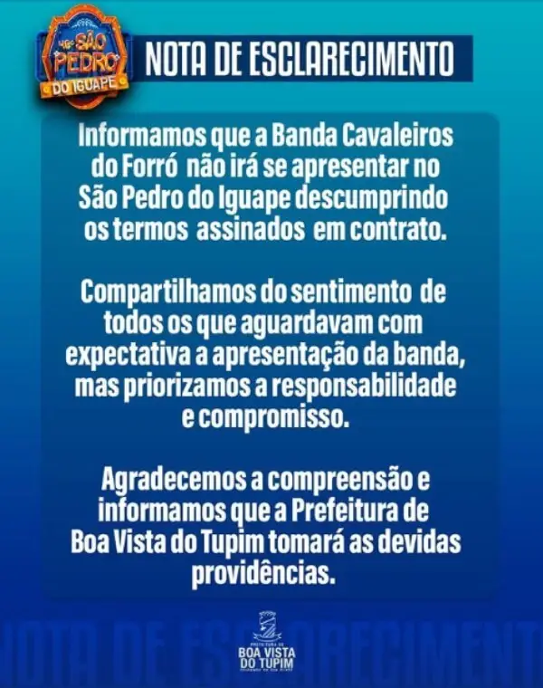 Em nota oficial, a Prefeitura de Boa Vista do Tupim informou que a banda Cavaleiros do Forró descumpriu cláusulas contratuais. A gestão municipal não detalhou o teor do descumprimento, mas afirmou que tomará as medidas cabíveis para resguardar o interesse público.
