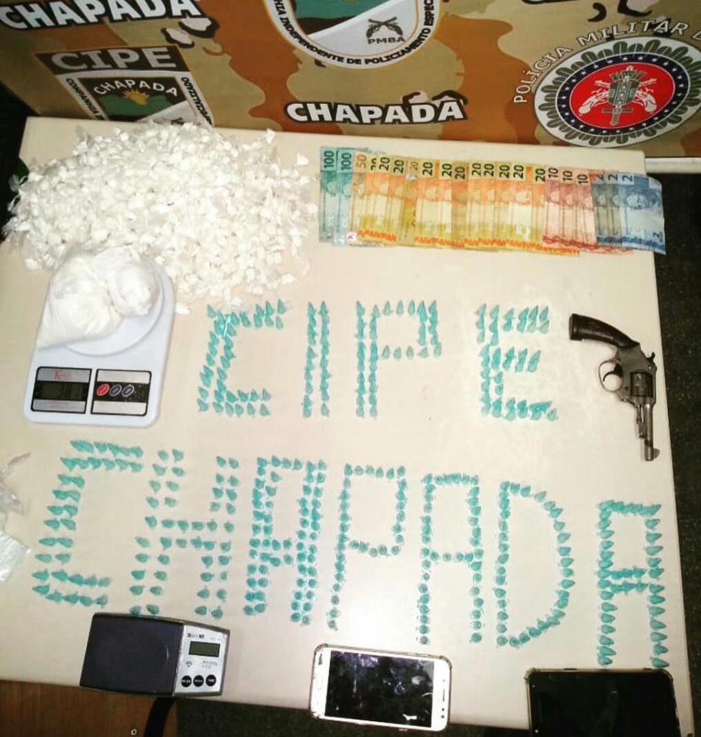 No final dois homens foram conduzidos a delegacia territorial de Seabra, sendo apreendidos um revolver calibre 32, R$ 536,00 em espécie, 1128 pinos com substancia análoga a cocaína e um saco com 388 gramas da mesma substancia.