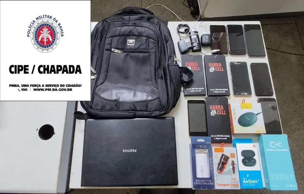 De posse das informações, a guarnição deslocou até o local onde encontraram um dos suspeitos em posse dos materiais, os quais foram reconhecidos pelo proprietário da loja Kal celulares.