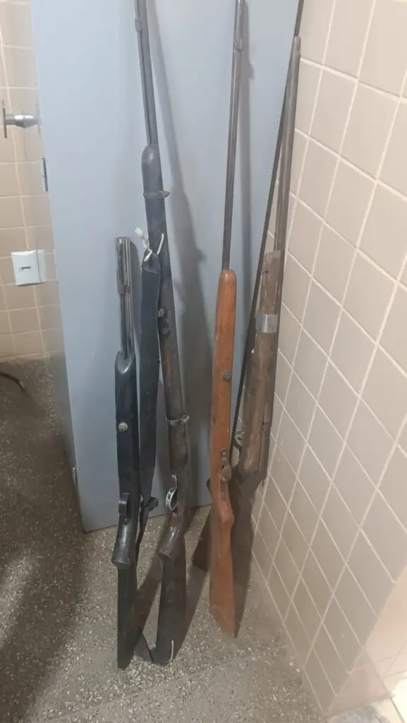 A guarnição, composta por quatro policiais militares e uma viatura, intensificava a presença na área quando localizou um acampamento improvisado em aparente estado de abandono. Durante a varredura no local, foram encontradas quatro espingardas artesanais escondidas sob uma lona e enterradas no solo — evidenciando a tentativa de ocultar os armamentos.