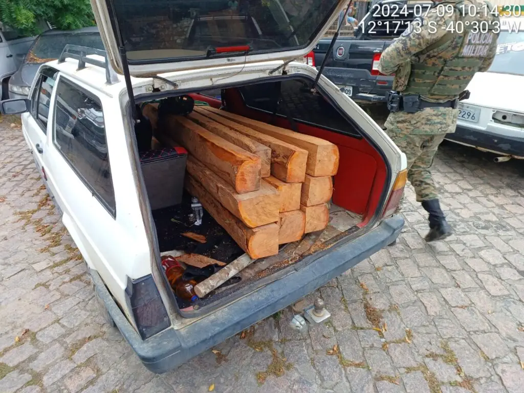 Nesta terça, 9 de julho de 2024, uma equipe policial composta pela VTR 7.1605 e três policiais militares realizava patrulhamento na localidade de Colobro, no Municipio de Ruy barbosa, quando abordou um veículo VW Parati branco. Durante a abordagem, os policiais encontraram troncos de madeira de grande porte no interior do veículo, que haviam sido extraídos ilegalmente.