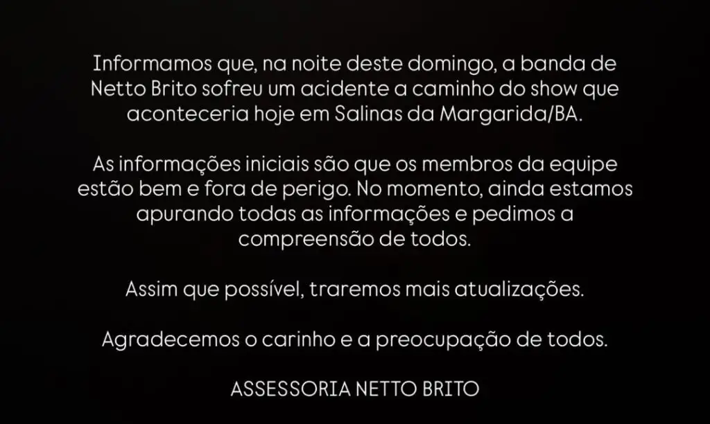 Apesar da gravidade do acidente, o cantor Netto Brito e os demais integrantes da banda não sofreram ferimentos e passam bem.
