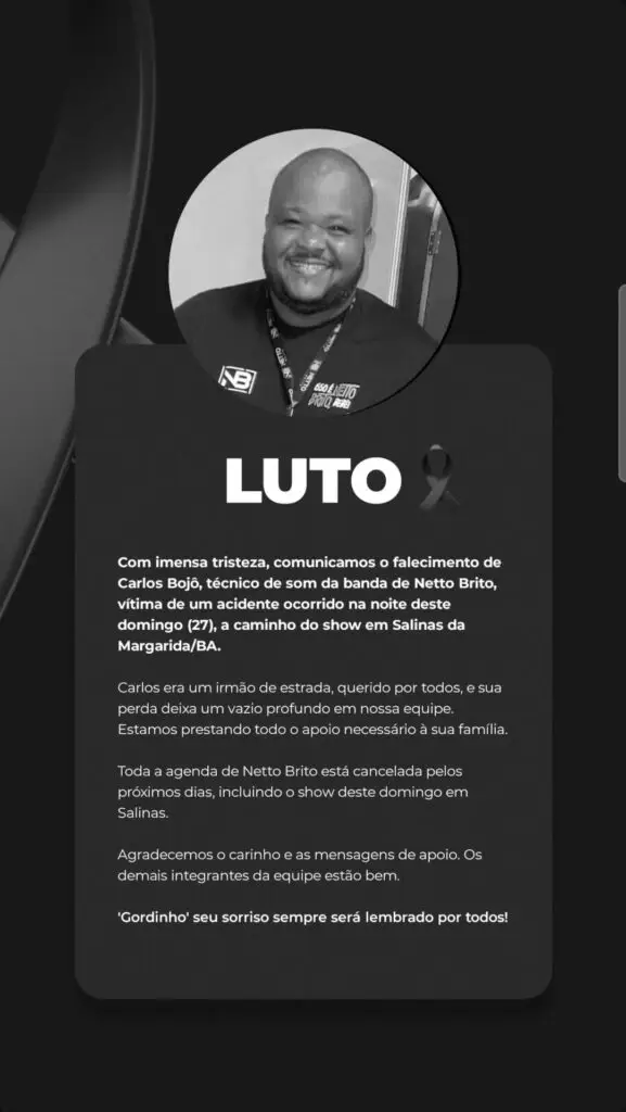 Infelizmente, o motorista do automóvel e sua esposa, moradores de Santo Antônio de Jesus, não resistiram aos ferimentos e morreram ainda no local. Os corpos foram removidos pelo Departamento de Polícia Técnica (DPT). Mais tarde o técnico de som da banda de Netto Brito não resistiu aos ferimentos evoluindo a óbito, a produção do artista emitiu uma nota de pesar.