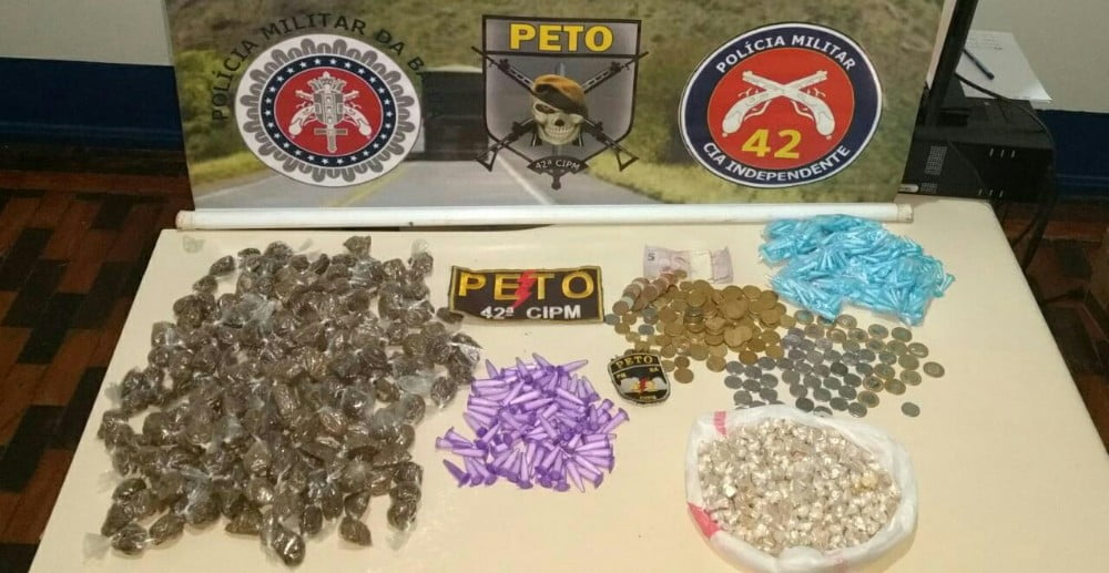 O jovem já é conhecido pelos militares por outras ocorrências com entorpecentes, estava com algumas amostras de drogas, no bolso, e afirmou que possuía mais em casa. Chegando na residência indicada, os PMs acharam 364 pinos de cocaína, 208 pedras de crack e 168 trouxas de maconha.