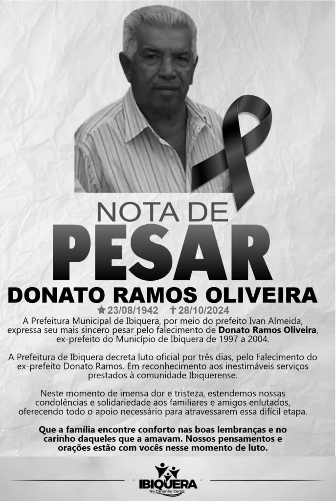 Em nota, a Prefeitura Municipal de Ibiquera, por meio do prefeito Ivan Almeida, expressou seus mais sinceros pesar pelo falecimento de Donato Ramos Oliveira. A prefeitura declarou luto oficial de três dias. “Neste momento de imensa dor e tristeza, estendemos nossas condolências e solidariedade aos familiares e amigos enlutados, oferecendo todo o apoio necessário para atravessarem essa difícil etapa”.
