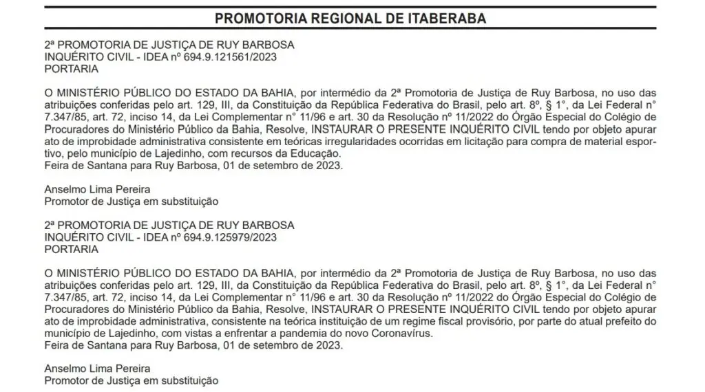 Foi publicado nesta quarta-feira (18/10) pelo Ministério Público Estadual (MP-BA) o Inquérito Civil – IDEA nº 694.9.121561/2023, tendo por objeto apurar ato de improbidade administrativa consistente em teóricas irregularidades ocorridas em licitação para compra de material esportivo, com recursos da Educação na cidade de Lajedinho, na Chapada Diamantina.