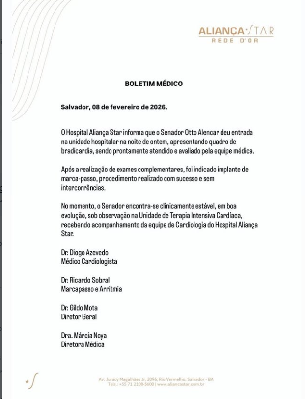 Otto Alencar é uma figura ativa da política baiana e nacional, com carreira que inclui passagem por cargos executivos no estado e no Congresso. A rápida resposta médica e o acompanhamento atual indicam que ele segue estável após o procedimento preventivo.