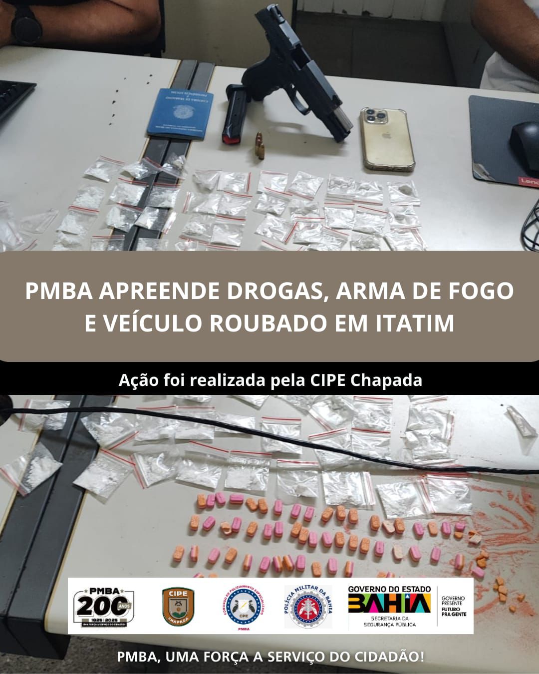 A Polícia Militar da Bahia, por meio da CIPE/Chapada, unidade vinculada ao Comando de Policiamento da Região da Chapada (CPE), realizou uma importante apreensão de drogas, arma de fogo e um veículo com restrição de furto/roubo na manhã do dia 20 de dezembro de 2025, no município de Itatim, na Chapada Diamantina.