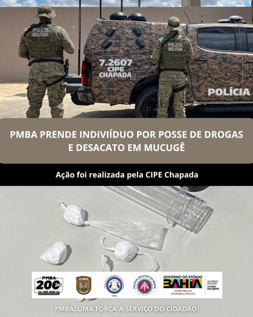 Na última quinta-feira (9), policiais da CIPE/Chapada prenderam um homem por posse de entorpecentes e desacato, no município de Mucugê, região da Chapada Diamantina.