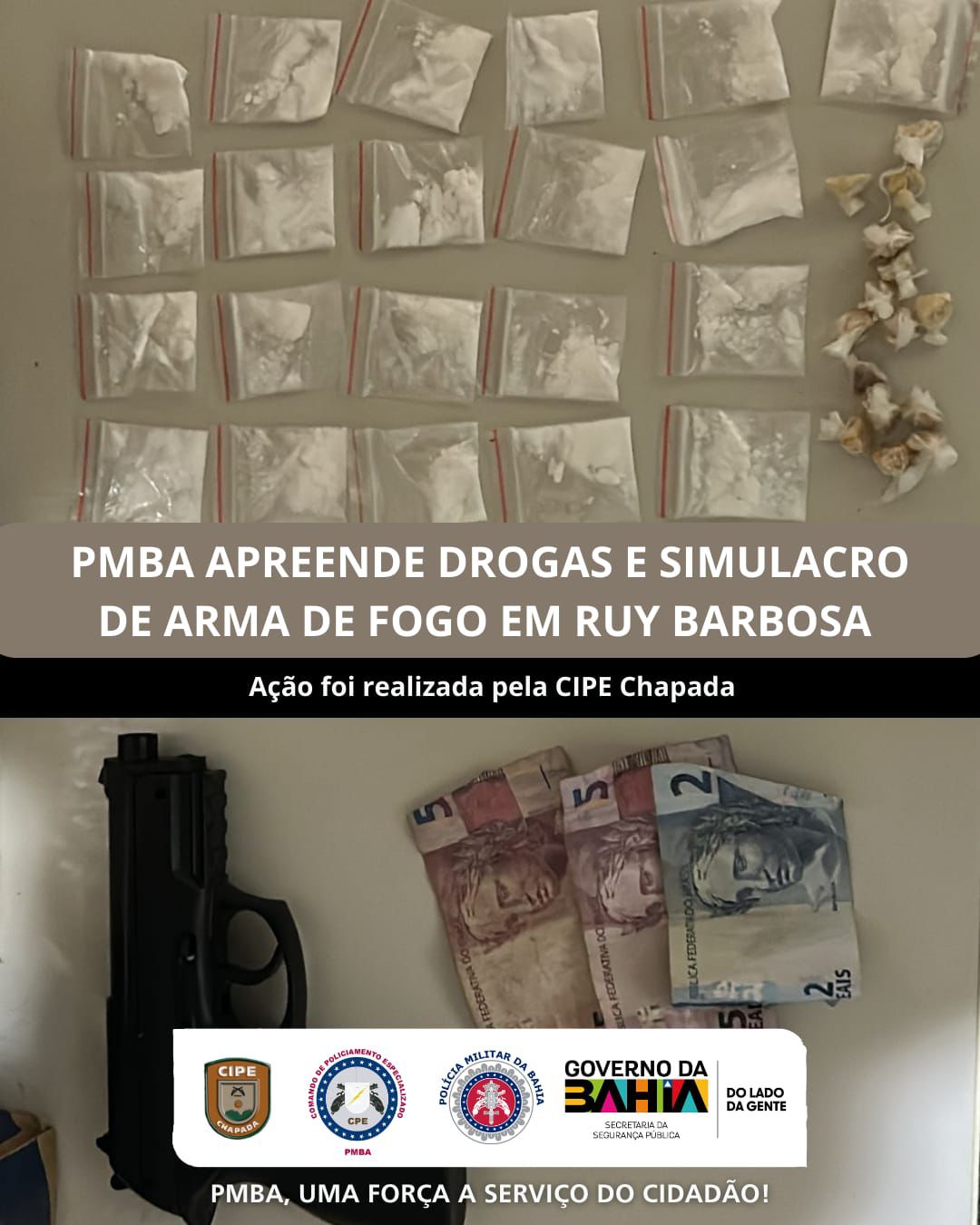 Uma ação da Polícia Militar resultou na apreensão de drogas e de um simulacro de arma de fogo na tarde deste domingo (15), no município de Ruy Barbosa, na Chapada Diamantina.