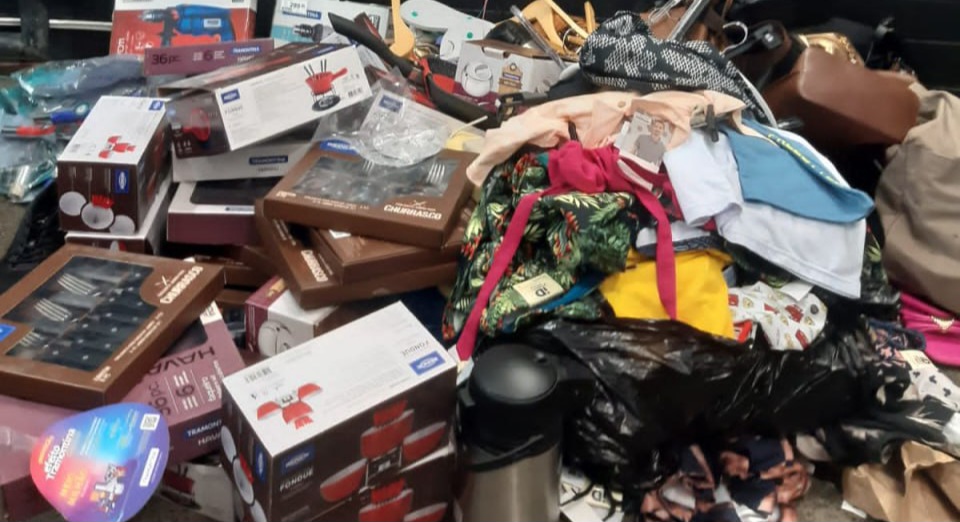 Com eles, foram apreendidos 34 bolsas, 57 peças de roupas, duas furadeiras, 15 torneiras, quatro faqueiros, oito conjuntos de fondue, duas farinheiras, 32 cabides, 20 pares de sandália, seis fritadeiras grill e 13 produtos cosméticos.