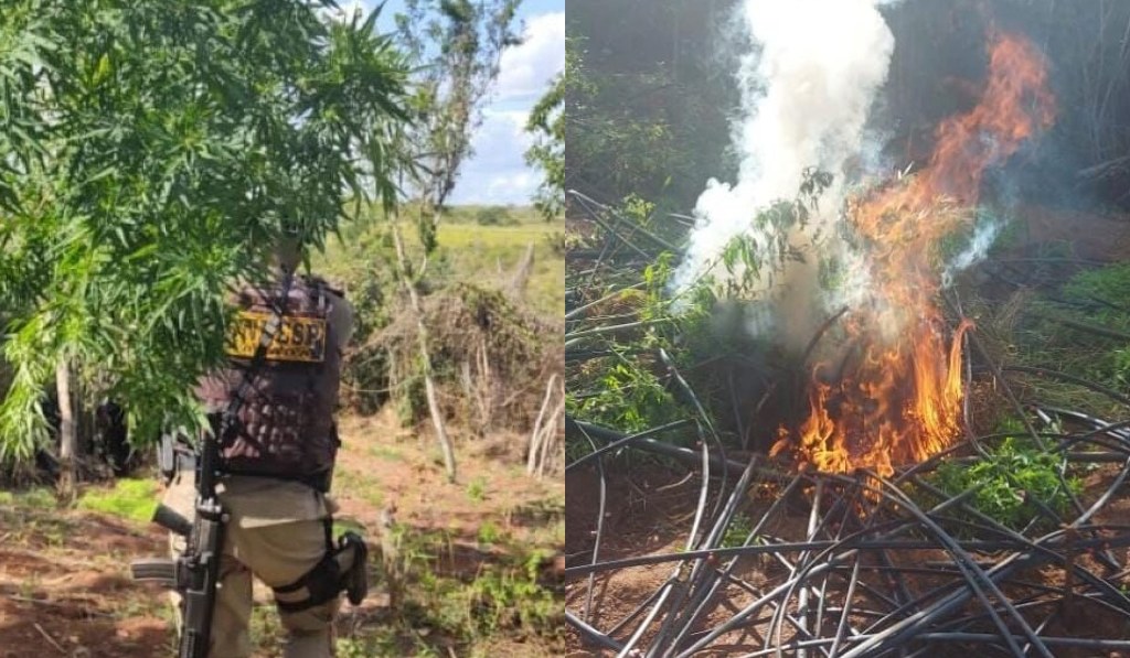 Os pés de maconha encontrados na zona rural foram incinerados, junto com uma estrutura de irrigação montada. Uma parte da droga foi apresentada na Delegacia Territorial (DT) da cidade.