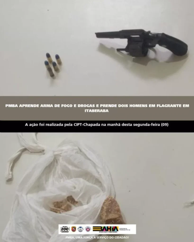 Na ação, a polícia apreendeu um revólver calibre .32, marca INA Tigre, com numeração suprimida, uma munição do mesmo calibre, quatro munições calibre 9 mm, porções de crack e cocaína, além de quatro petecas de cocaína e duas balanças de precisão. Os dois suspeitos receberam voz de prisão no local.