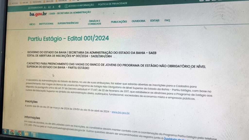 A relação dos estudantes selecionados para o Programa Partiu Estágio também será disponibilizada no site Saeb (www.saeb.ba.gov.br). Mais informações podem ser obtidas neste link