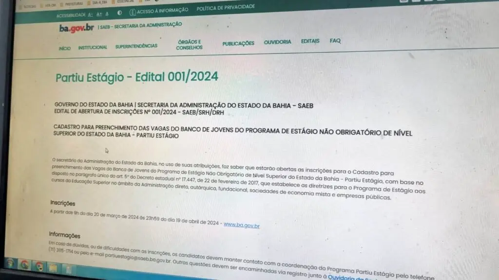 A relação dos estudantes selecionados para o Programa Partiu Estágio também será disponibilizada no site Saeb (www.saeb.ba.gov.br). Mais informações podem ser obtidas neste link.