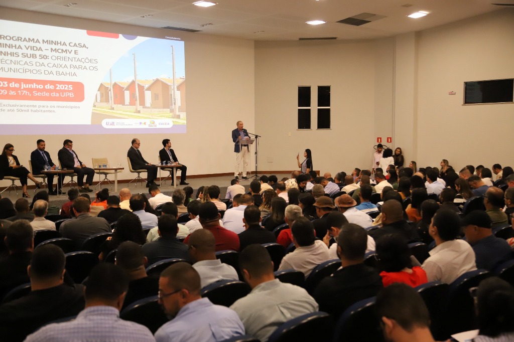 Prefeitos, prefeitas e equipes técnicas das prefeituras participaram nesta terça-feira (3) da orientação técnica da Caixa e da União dos Municípios da Bahia (UPB) para seleção do Programa Minha Casa, Minha Vida, direcionada a municípios com menos de 50 mil habitantes. O evento realizado na sede da UPB, em Salvador, reuniu mais de 350 participantes e esclareceu dúvidas sobre a Portaria MCID Nº 483, de 19 de maio de 2025, que traz as regras para a contratação de 2.004 unidades habitacionais para as cidades da Bahia.