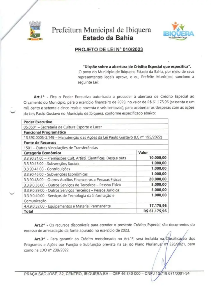 O crédito adicional possui dotações orçamentárias contempladas pela Lei Federal Complementar n° 195, de 8 de julho de 2022, instituída como “Lei Paulo Gustavo”, que visa dar celeridade e efetividade às atividades e produtos culturais.